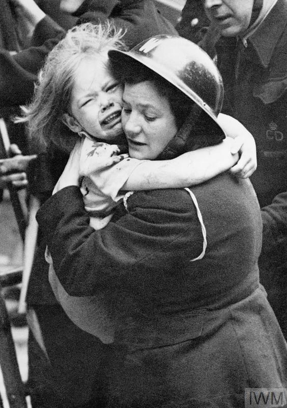 Florence Kelly, a female warden, carrying Suzanne Oliphant, a little girl, after she had been rescued by a fireman from a house, IWM