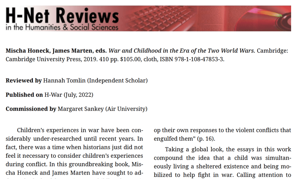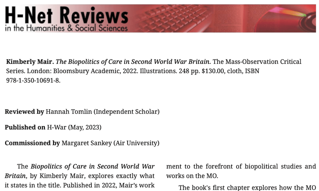 Publications Book Review – Tomlin on Honeck and Marten, ‘War and Childhood in the Era of the Two World Wars.’ Book Review – Tomlin on Mair, ‘The Biopolitics of Care in Second World War Britain.’ Book Review – Tomlin on Healy and Barry, ‘Family Histories of World War II: Survivors and Descendants.’ Share this: Click to share on X (Opens in new window) X Click to share on Facebook (Opens in new window) Facebook Click to share on WhatsApp (Opens in new window) WhatsApp Click to email a link to a friend (Opens in new window) Email Click to print (Opens in new window) Print Like Loading...